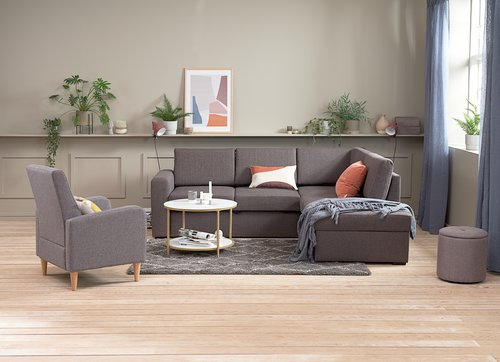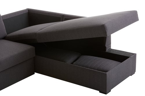 Garnitura od tkanine, sa lenjivcem. Lako se razvlači u krevet. Sjedište sa džepićastim oprugama i punjenjem od pjene. Naslon od pjene. Sa prostorom za odlaganje. Fiksni ugaoni deo. Površina za spavanje: 150x1985 cm. Š226xV86xDub88/203 cm