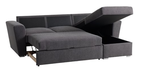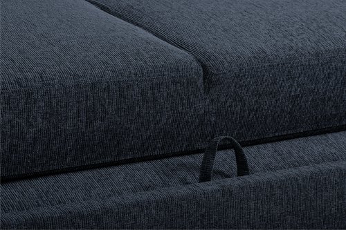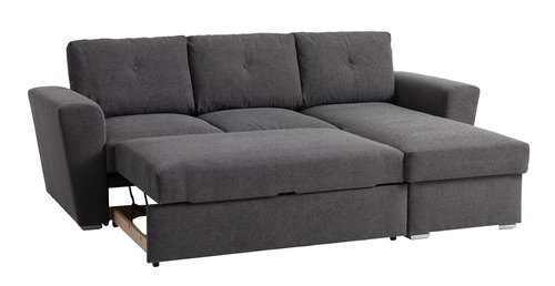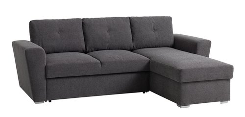 Garnitura od tkanine, sa lijenjivcem. Lako se razvlači u krevet. Sjedište i naslon od pjene. Sa prostorom za odlaganje. Lijevi ili desni ugaoni dio. Površina za spavanje: 141x195 cm. Š243xV86xDub83/154 cm
